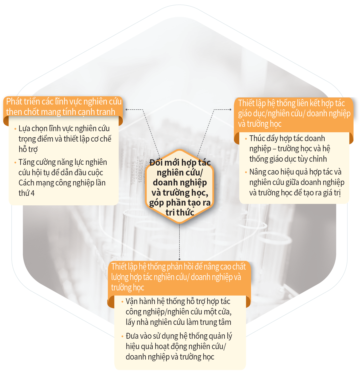 Đổi mới hợp tác nghiên cứu/doanh nghiệp và trường học, góp phần tạo ra tri thức Phát triển các lĩnh vực nghiên cứu then chốt mang tính cạnh tranh • Lựa chọn lĩnh vực nghiên cứu trọng điểm và thiết lập cơ chế hỗ trợ • Tăng cường năng lực nghiên cứu hội tụ để dẫn đầu cuộc Cách mạng công nghiệp lần thứ 4 Thiết lập hệ thống liên kết hợp tác giáo dục/nghiên cứu/ doanh nghiệp và trường học • Thúc đẩy hợp tác doanh nghiệp – trường học và hệ thống giáo dục tùy chỉnh • Nâng cao hiệu quả hợp tác và nghiên cứu giữa doanh nghiệp và trường học để tạo ra giá trị Thiết lập hệ thống phản hồi để nâng cao chất lượng hợp tác nghiên cứu/ doanh nghiệp và trường học • Vận hành hệ thống hỗ trợ hợp tác công nghiệp/nghiên cứu một cửa, lấy nhà nghiên cứu làm trung tâm • Đưa vào sử dụng hệ thống quản lý hiệu quả hoạt động nghiên cứu/ doanh nghiệp và trường học